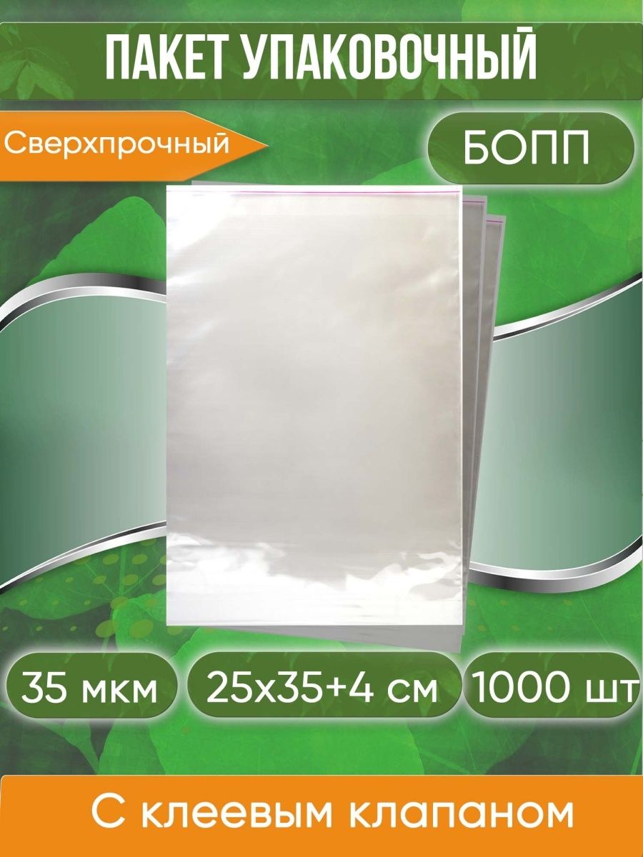 —Пакет упаковочный БОПП с клеевым клапаном, 25х35+4 см, сверхпрочный, 35 мкм, 1000 шт.