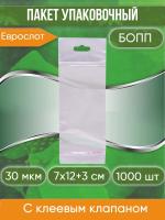 —Пакет упаковочный БОПП с клеевым клапаном, 7х12+3 см, с европодвесом, 30 мкм, 1000 шт